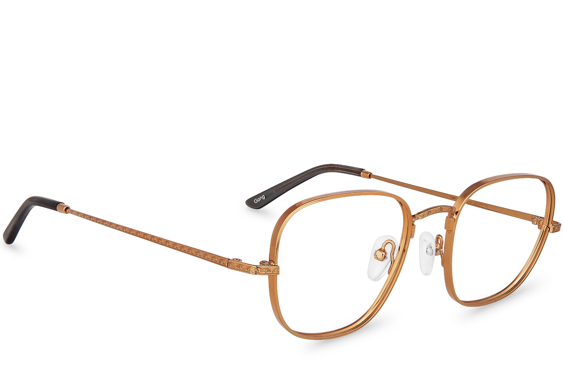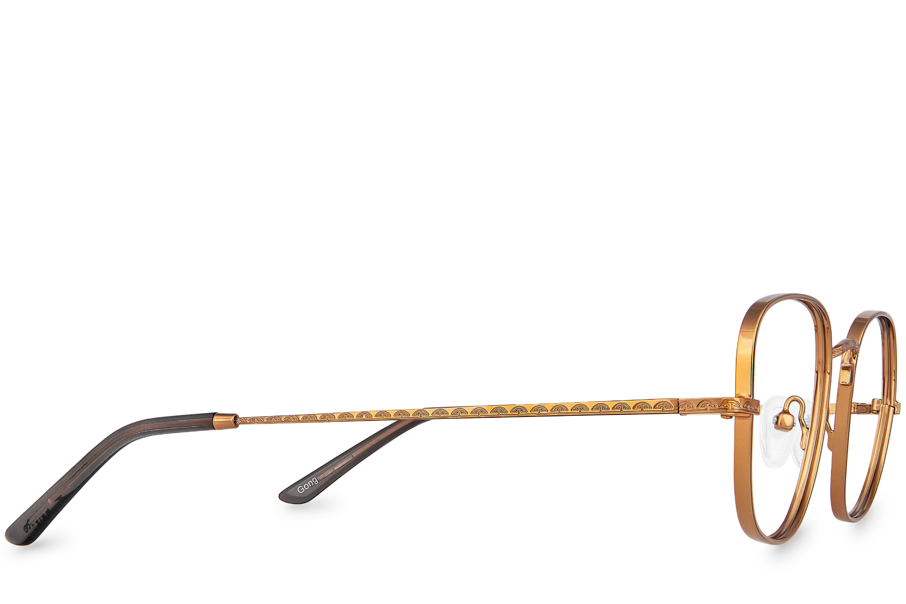 Did you know that bamboos are a variety of grass? Amazing given their height! Gong View will surprise you too! A pair of rectangular brown metal glasses with a bridge and temples finely engraved with traditional Chinese patterns.